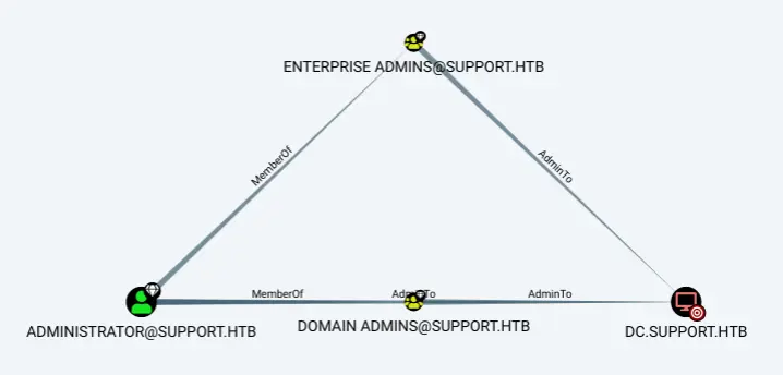 I’ll need to know the administrator on DC, which Bloodhound tells me is administrator@support.htb: