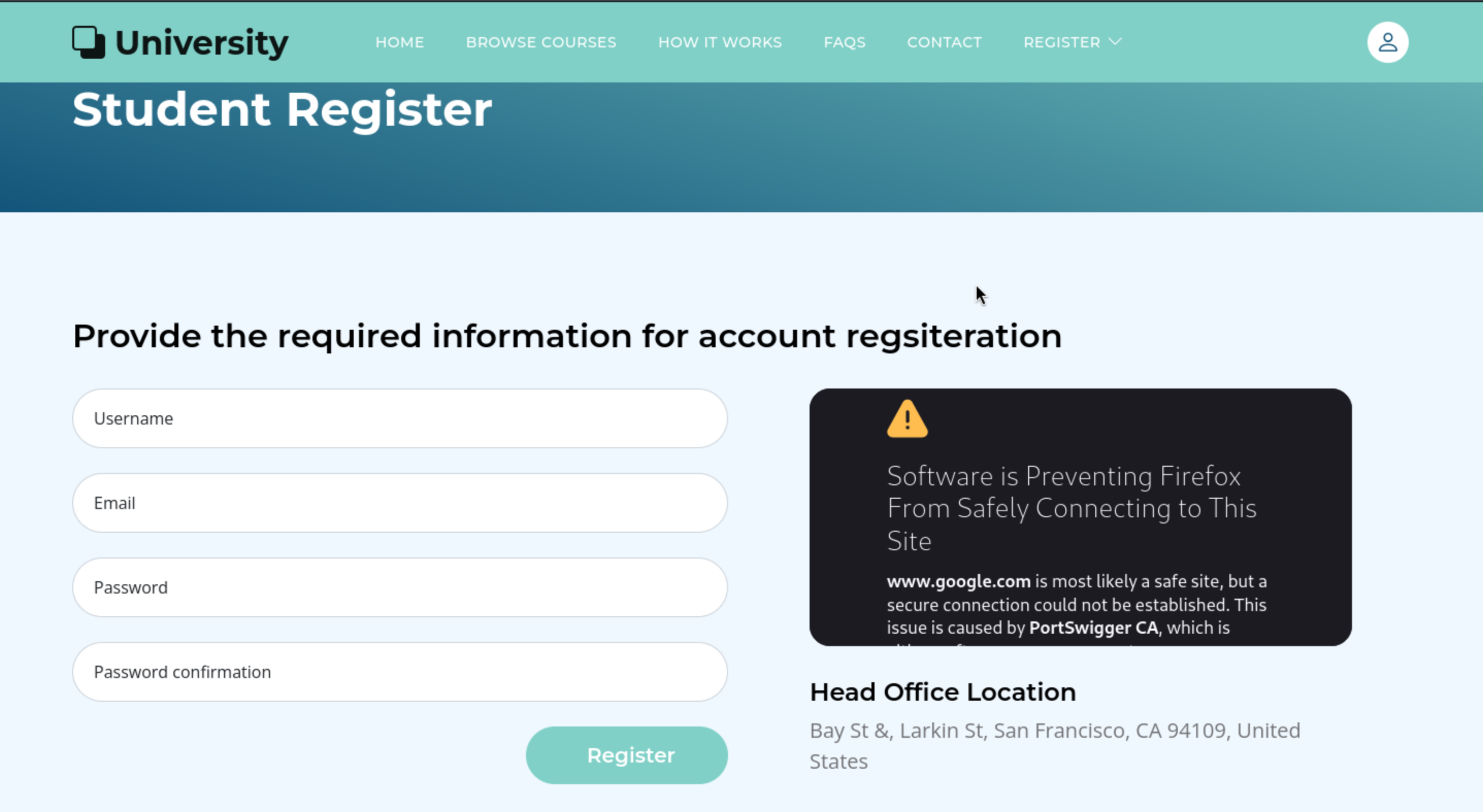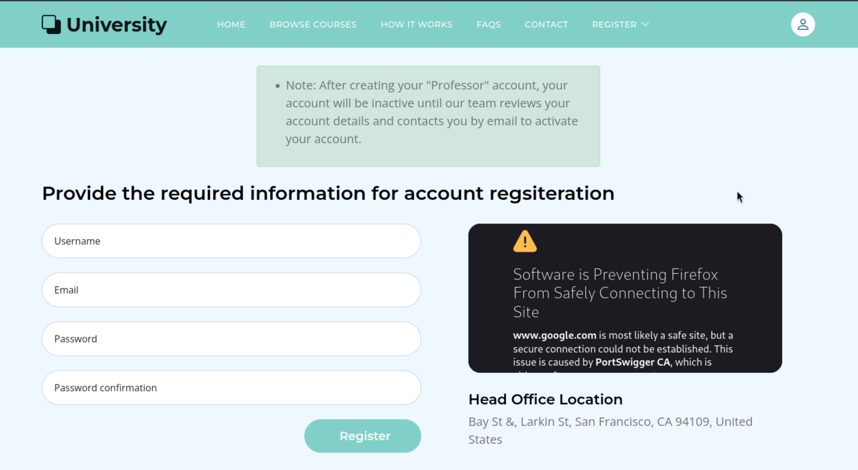 In this place, it needs the employee to confirm the request to create the account of professor.So I guess there would be XSS vulner.