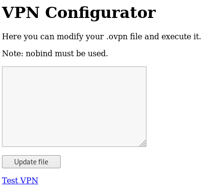 If I click “Test VPN”, it directs to http://192.168.122.4/vpnconfig.php?function=testvpn and prints “executed succesfully!” (typo in successfully) at the top. There is way to get RCE through a OpenVPN config. The short description is that a config can contain an up entry which is the command to execute after the connection is made. https://www.bleepingcomputer.com/news/security/downloading-3rd-party-openvpn-configs-may-be-dangerous-heres-why/ The payload would be