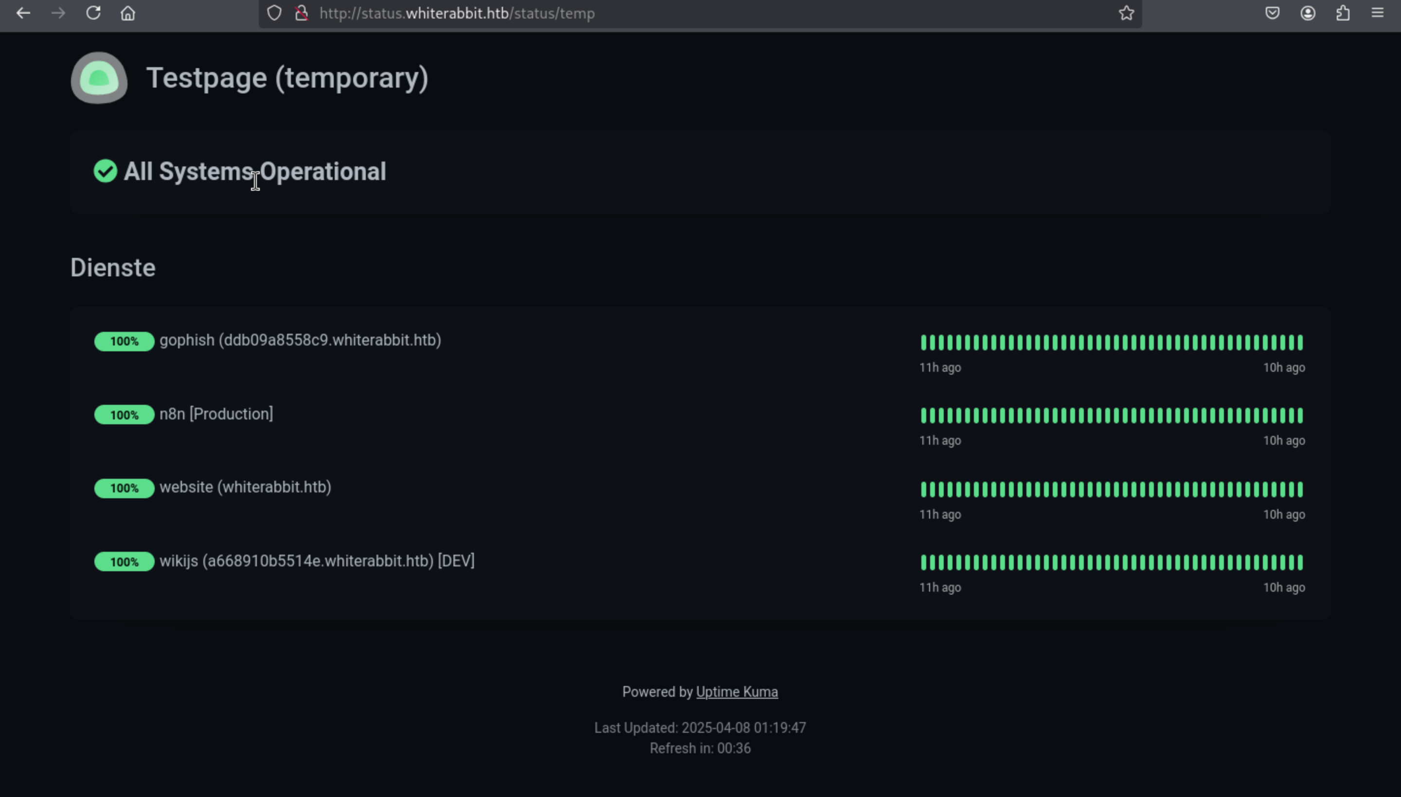 http://status.whiterabbit.htb/dashboard [200 OK] Country[RESERVED][ZZ], HTML5, HTTPServer[Caddy], IP[10.10.11.63], Script[module], Title[Uptime Kuma], X-Frame-Options[SAMEORIGIN]