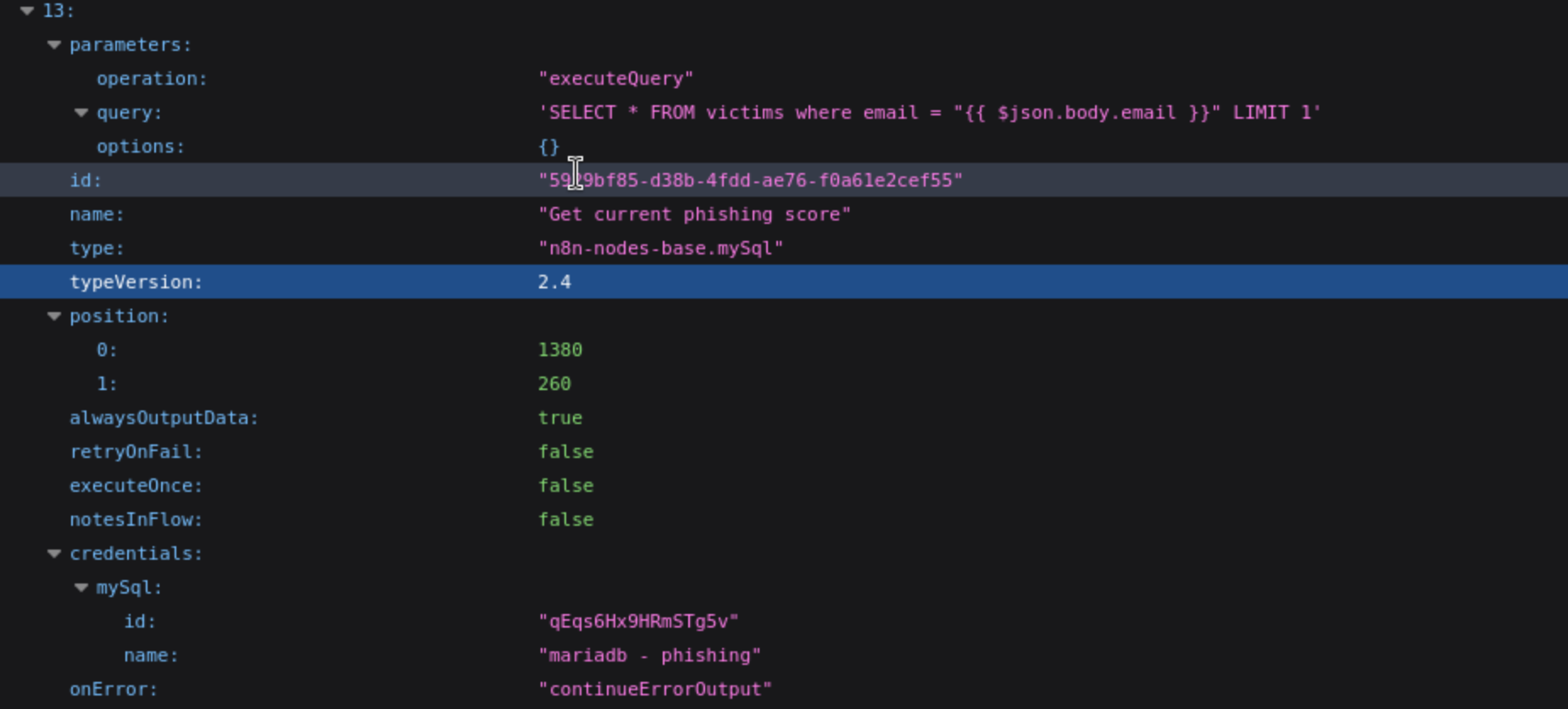 - An n8n webhook node receives POST requests from Gophish.